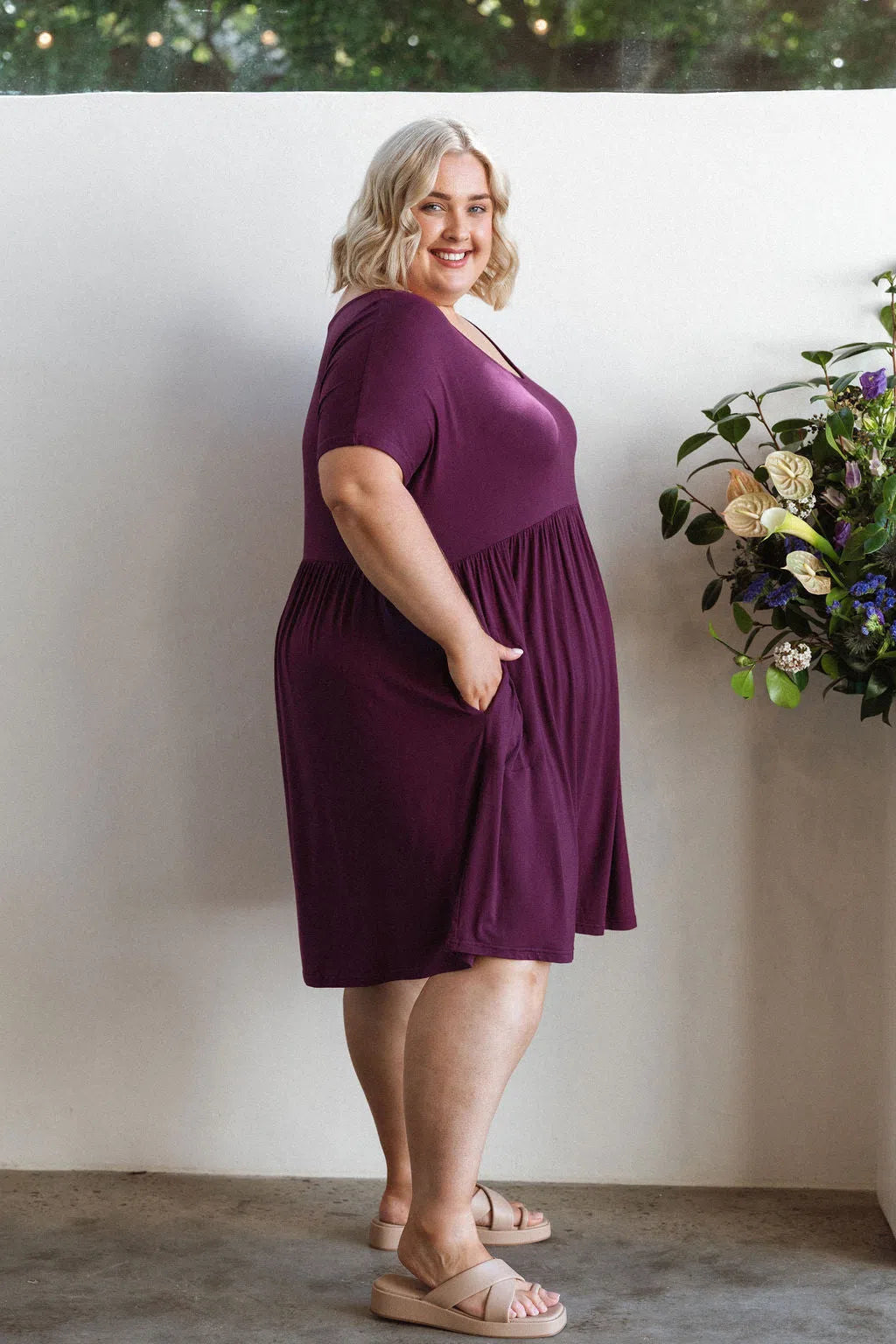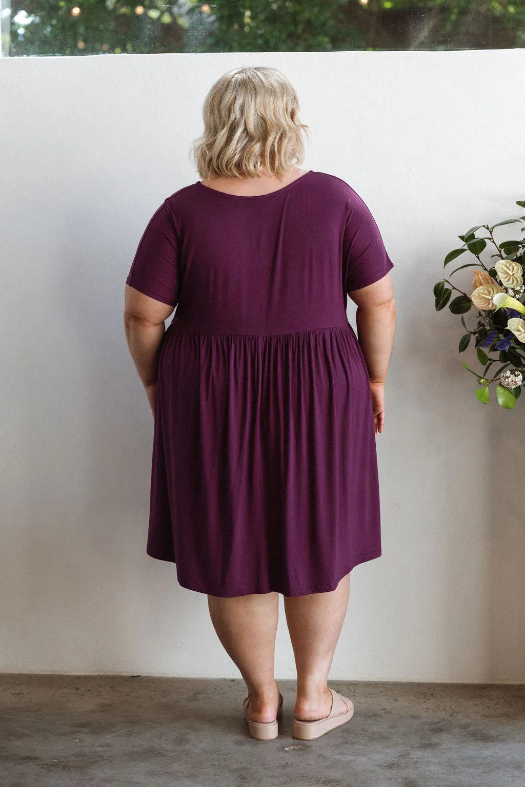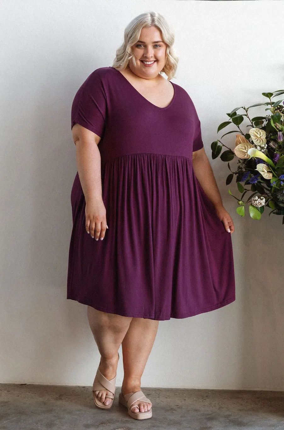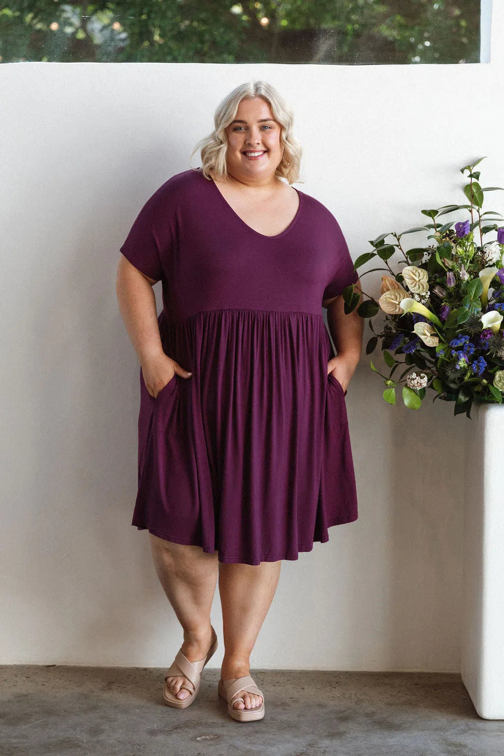 A wardrobe staple. Easy slip on dress with pockets. Baby doll style so falls from bust. Soft stretchy flowy material. I wear mine with leggings, great length. I have this is in many colours..berry is super pretty. Washes well, time n time again..plus no ironing required.