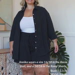 Annika wears a size 16/18 in the Reese Shirt and a 14/16 in the Romy Shorts.