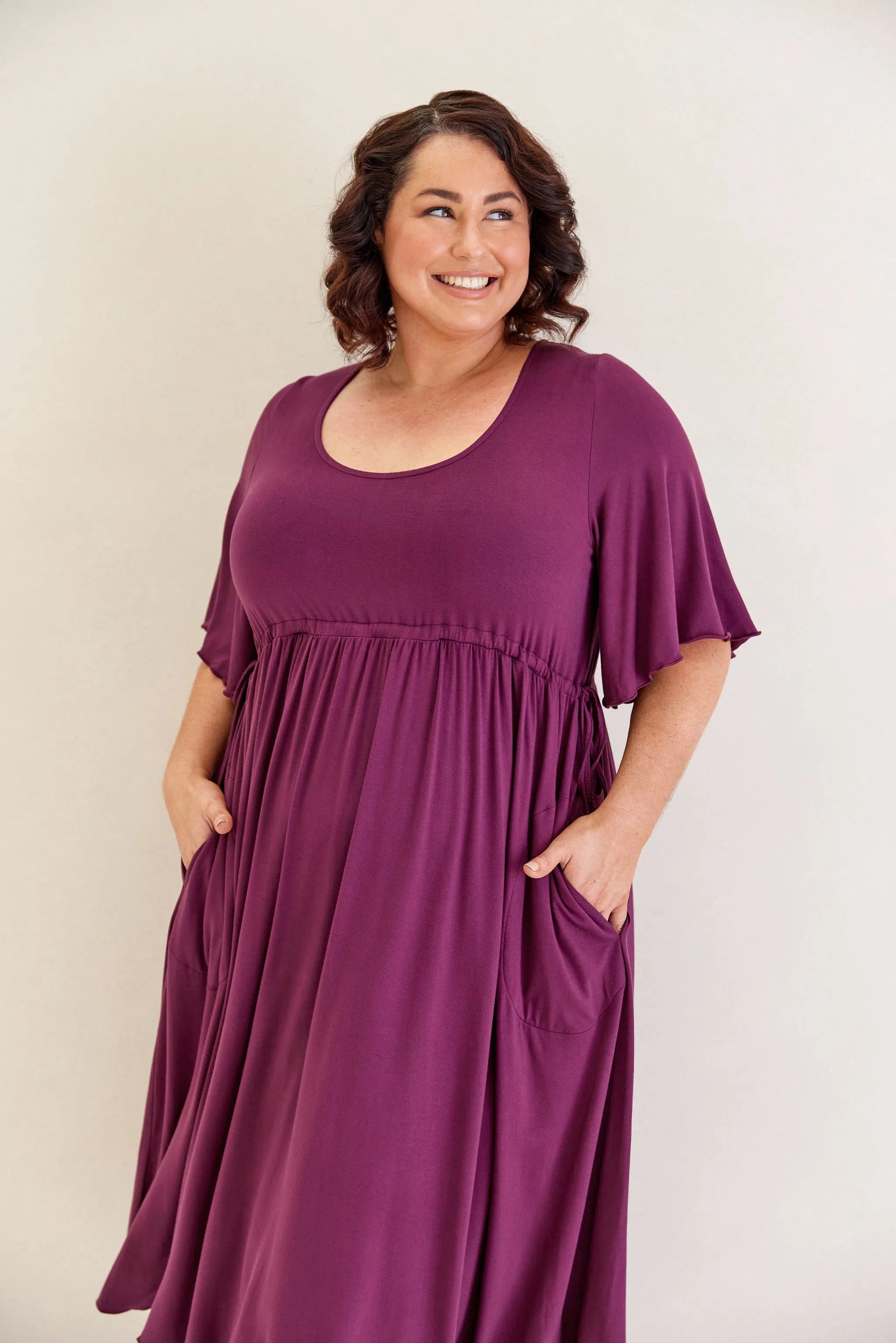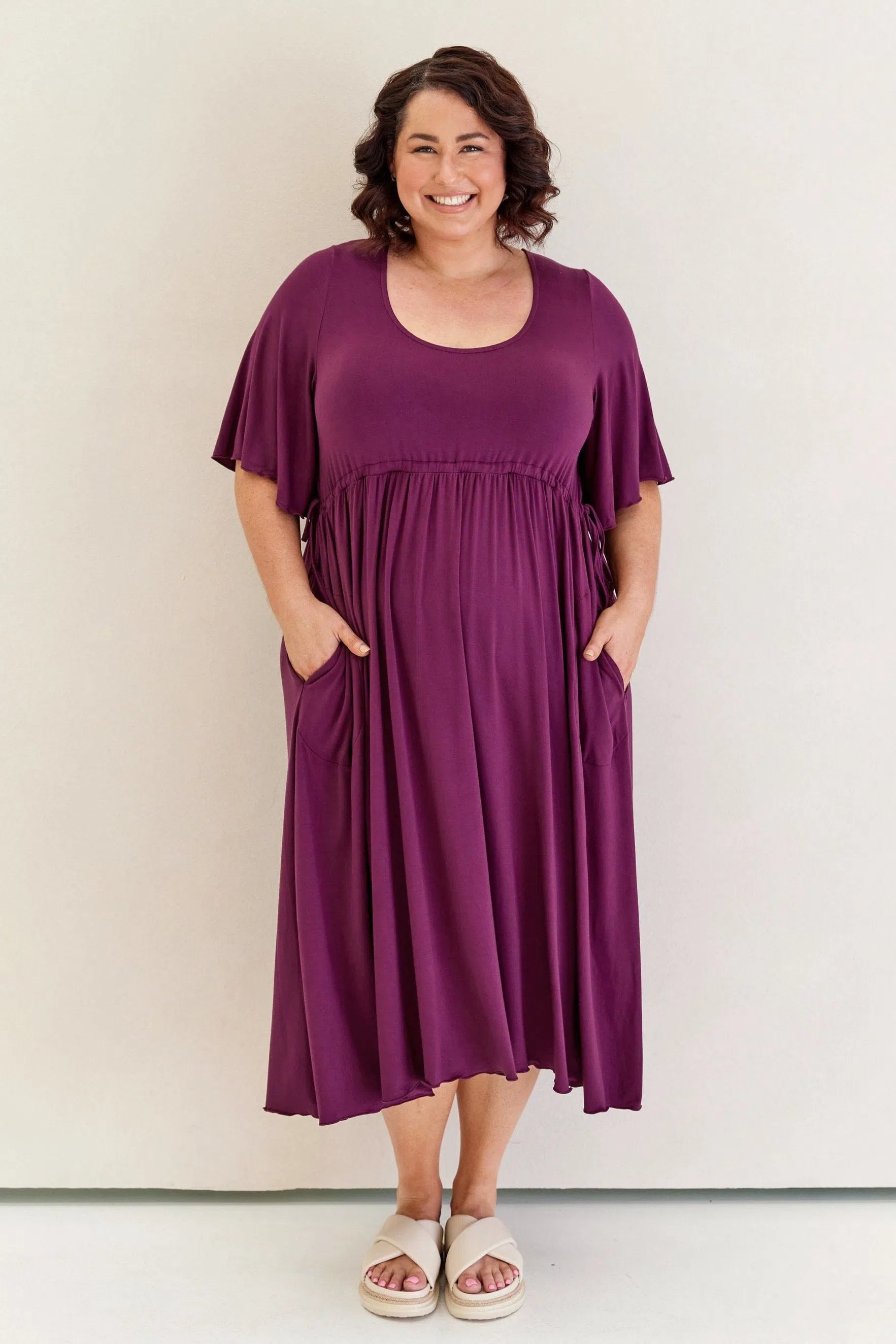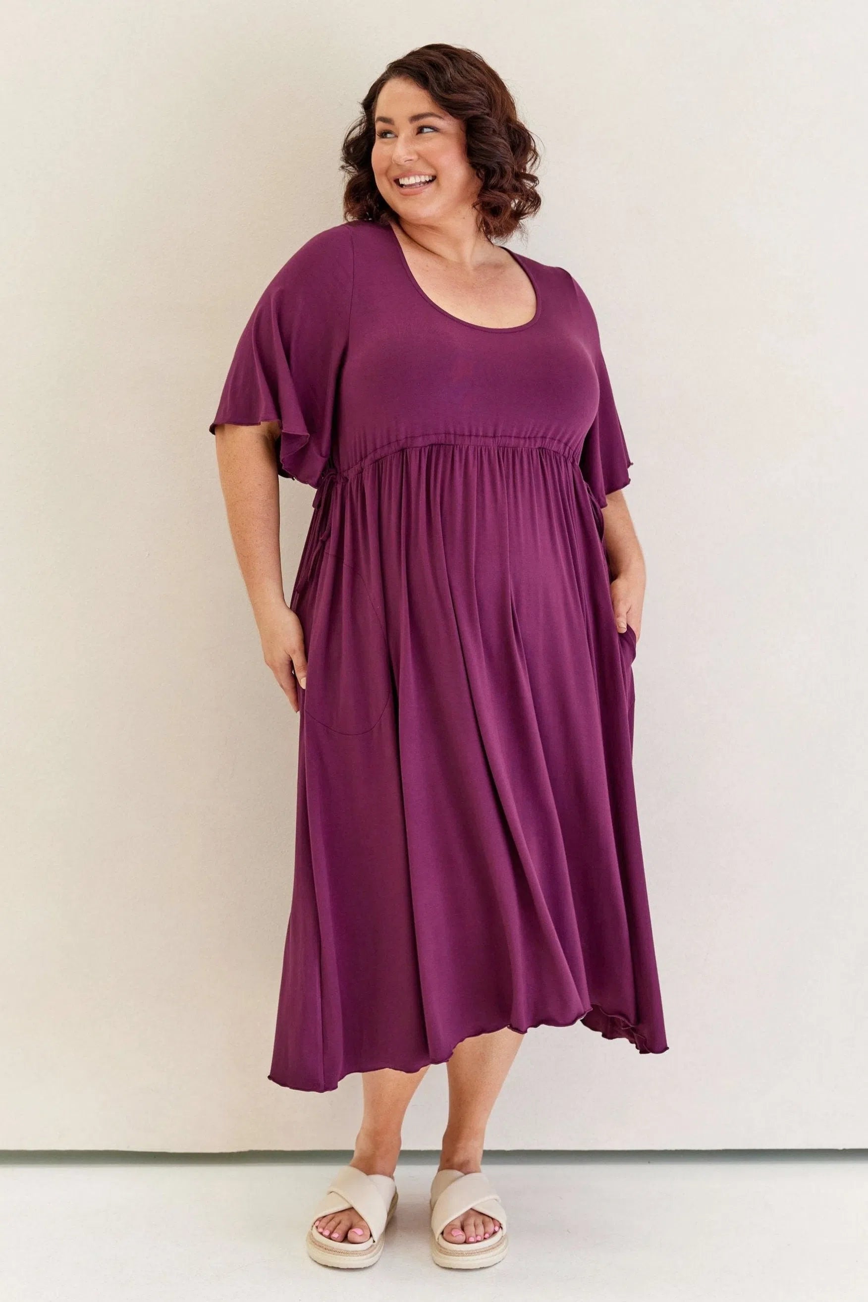 This is the comfortable and floaty dress of your dreams! Easy to cinch in under the bust or have a little looser with flattering sleeves and pockets!