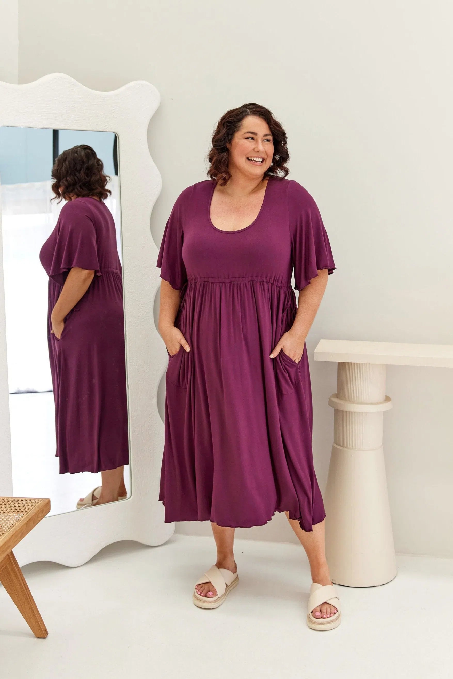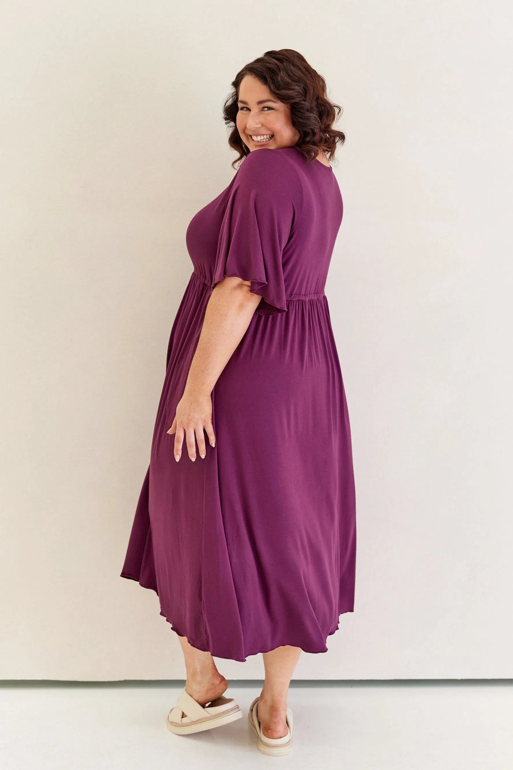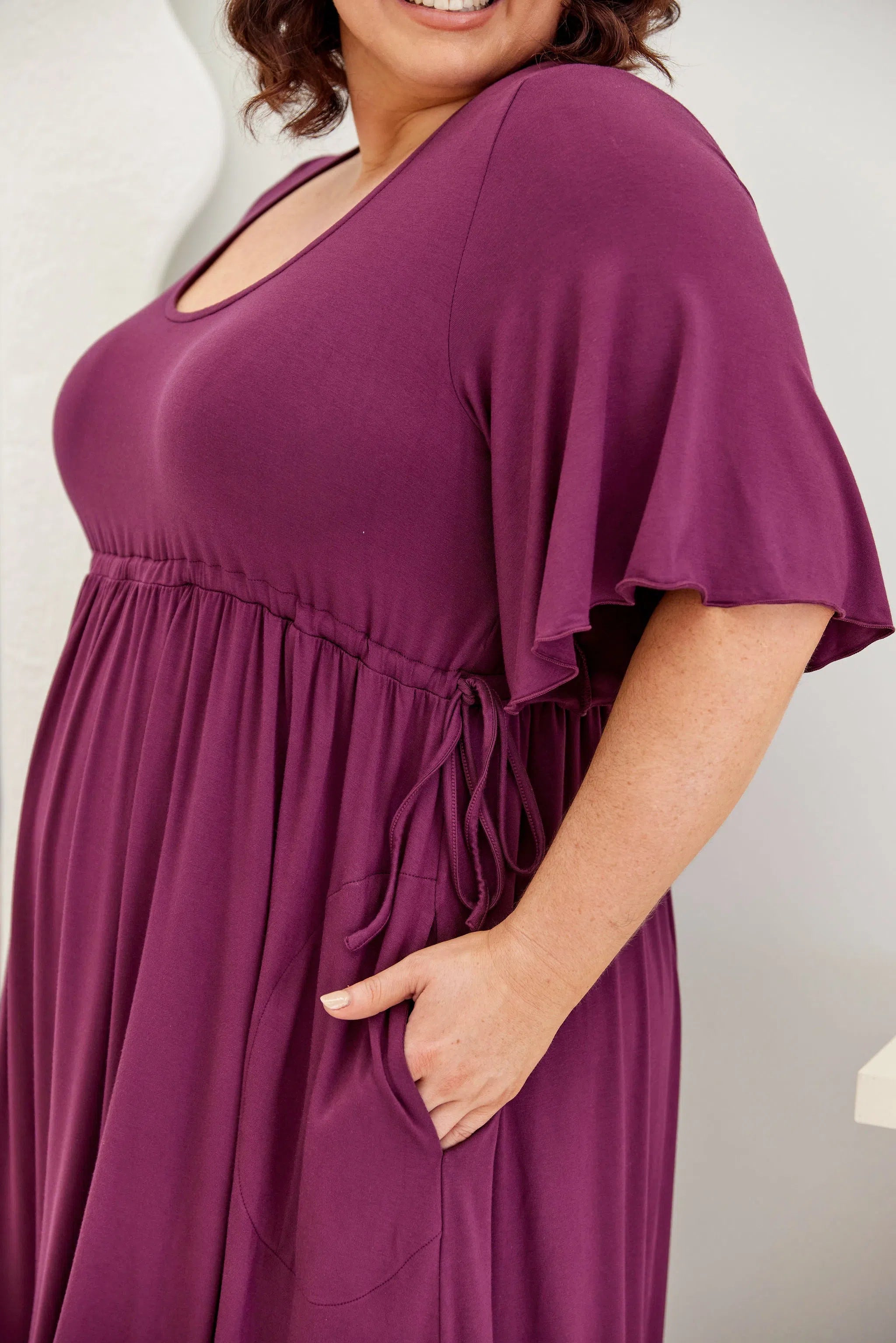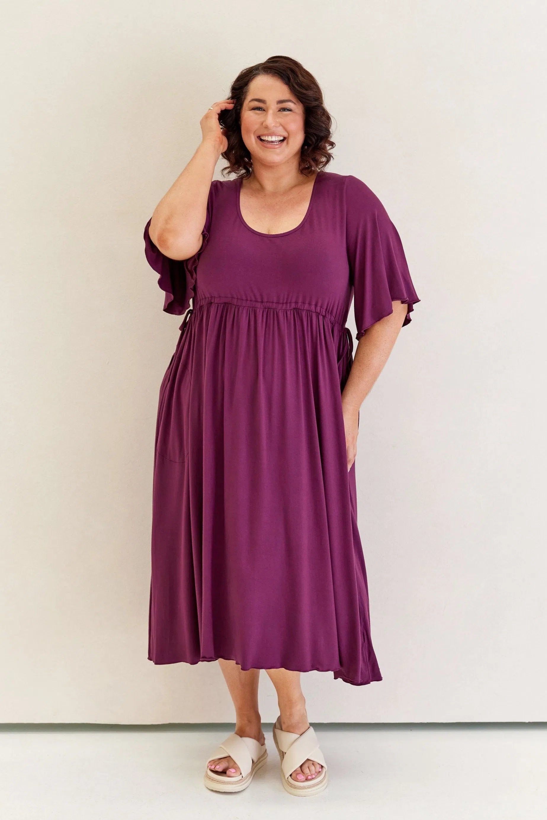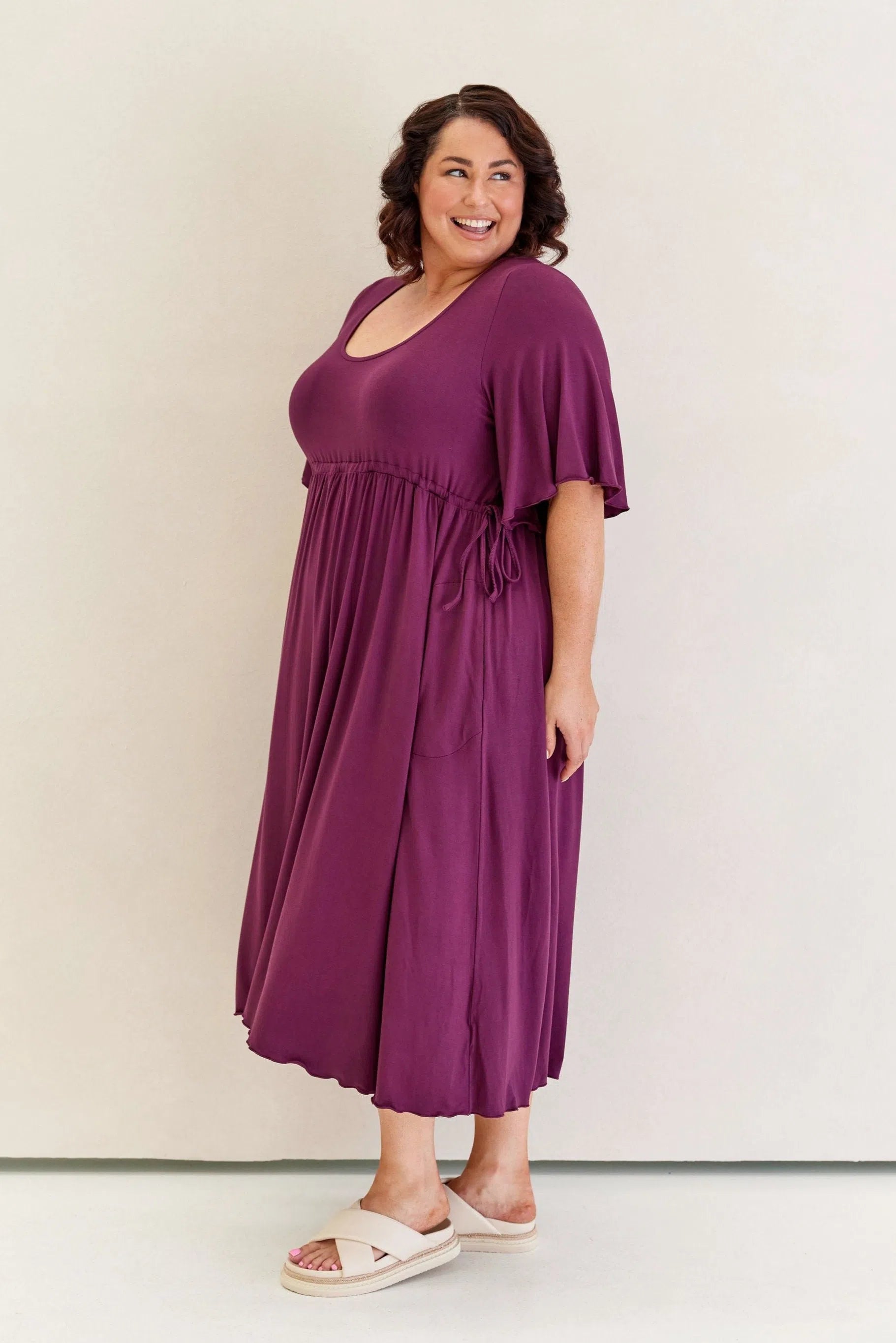 Feminine, floaty and comfy! This dress has so much swish and movement, with its generous skirt and babylock hem detail. Made from our famous super soft, stretchy jersey and with functional side ties at the waist, this piece is easy to wear and will shape to your body (our bodies all fluctuate, so our clothes should be made to accomodate!) This laid back style has feminine details that elevate the design so you can wear it casually or dress it up. Its got great upper arm and tum/bum coverage, while showing shape at the waist and showing just the right amount of cleavage (but you can still wear your normal bra). This design is sure to be a favourite among Peach loyals!