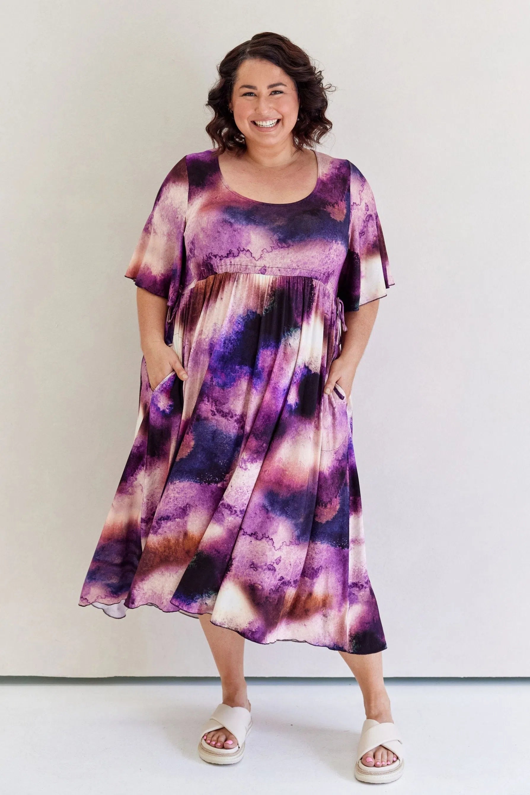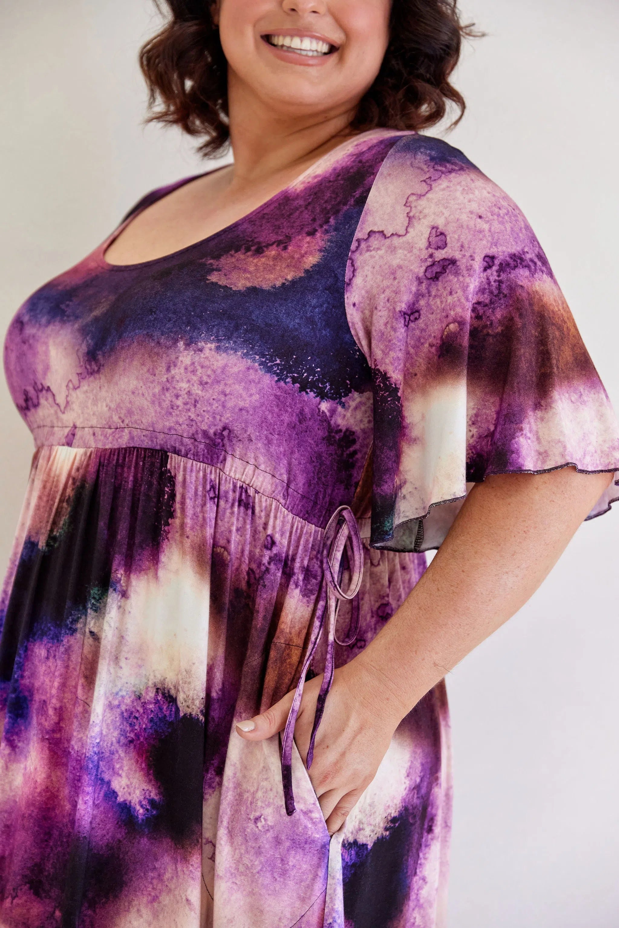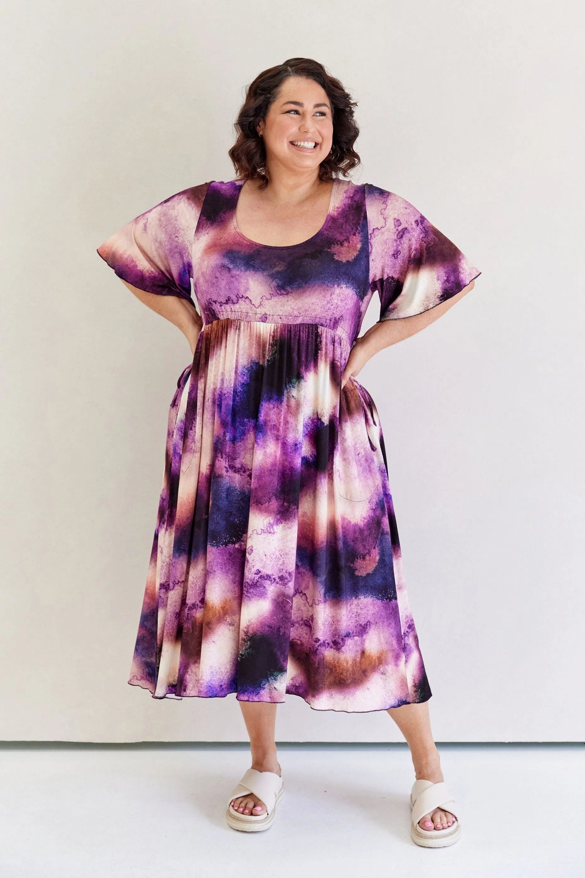 Feminine, floaty and comfy! This dress has so much swish and movement, with its generous skirt and babylock hem detail. Made from our famous super soft, stretchy jersey and with functional side ties at the waist, this piece is easy to wear and will shape to your body (our bodies all fluctuate, so our clothes should be made to accomodate!) This laid back style has feminine details that elevate the design so you can wear it casually or dress it up. Its got great upper arm and tum/bum coverage, while showing shape at the waist and showing just the right amount of cleavage (but you can still wear your normal bra). This design is sure to be a favourite among Peach loyals!