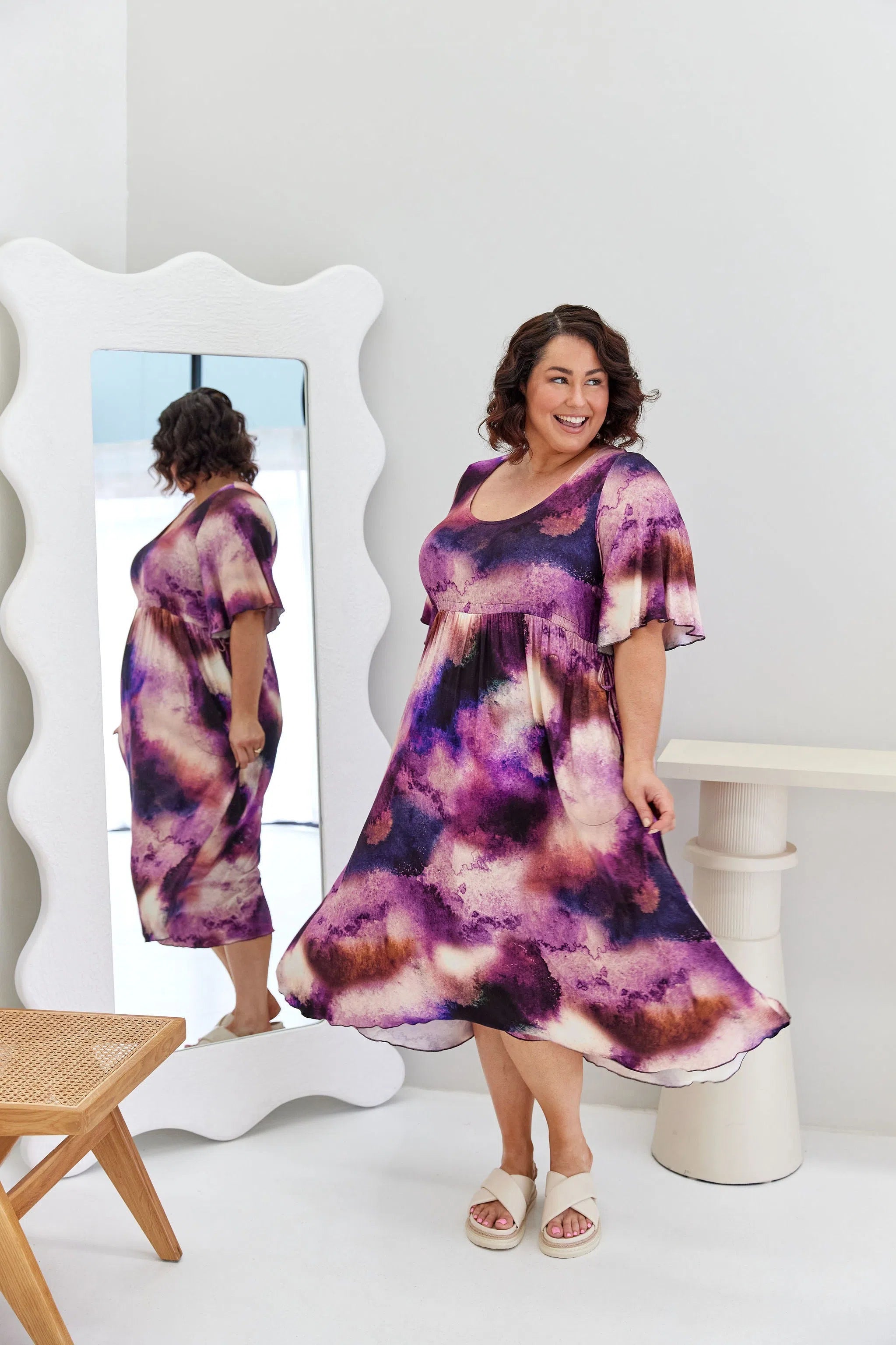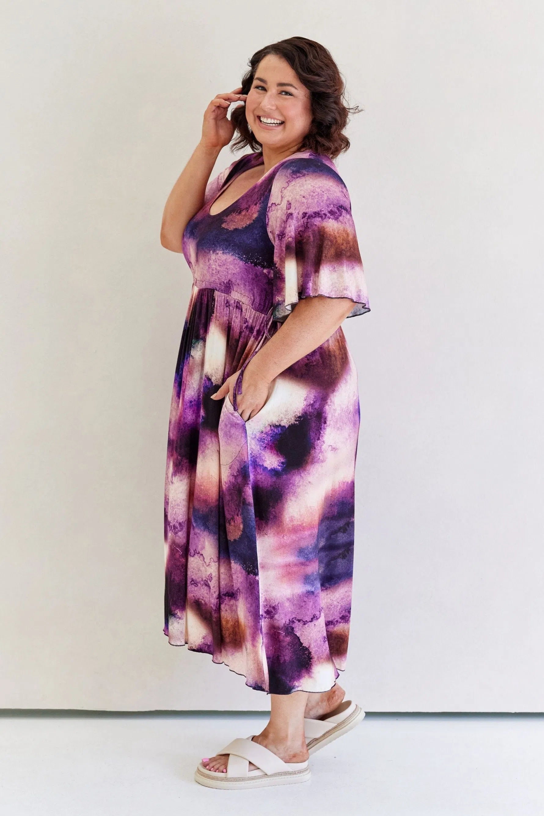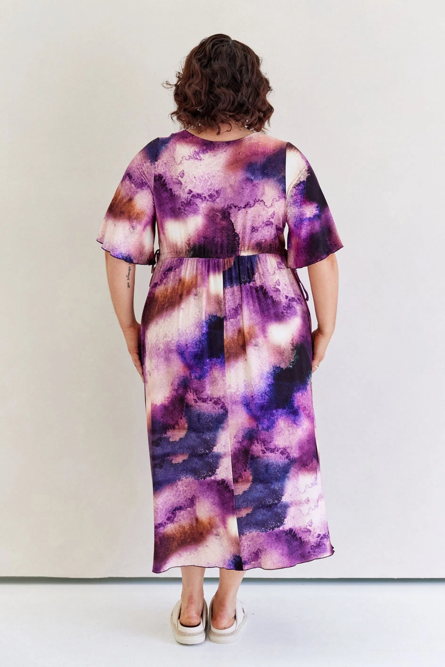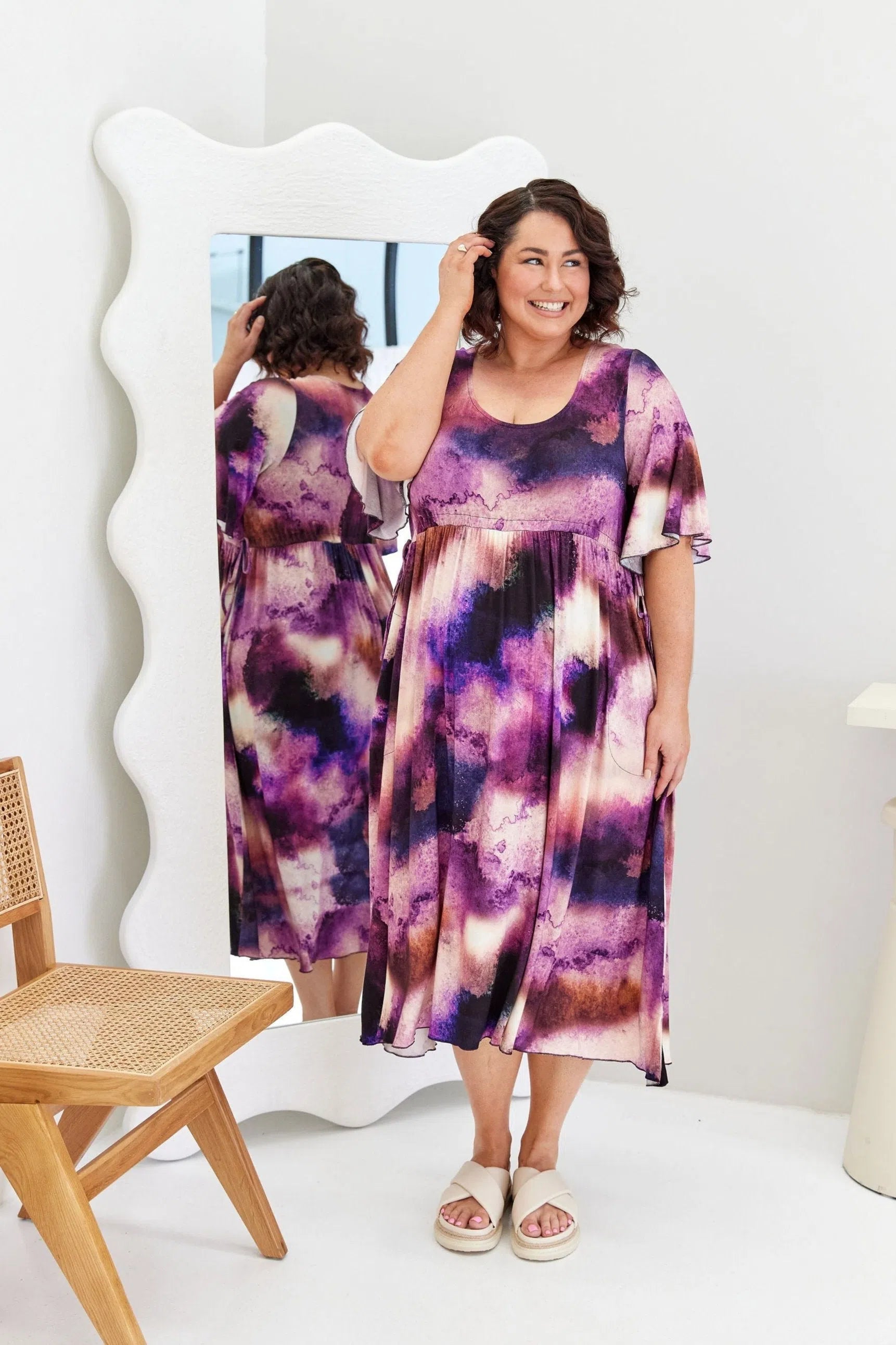 Feminine, floaty and comfy! This dress has so much swish and movement, with its generous skirt and babylock hem detail. Made from our famous super soft, stretchy jersey and with functional side ties at the waist, this piece is easy to wear and will shape to your body (our bodies all fluctuate, so our clothes should be made to accomodate!) This laid back style has feminine details that elevate the design so you can wear it casually or dress it up. Its got great upper arm and tum/bum coverage, while showing shape at the waist and showing just the right amount of cleavage (but you can still wear your normal bra). This design is sure to be a favourite among Peach loyals!
