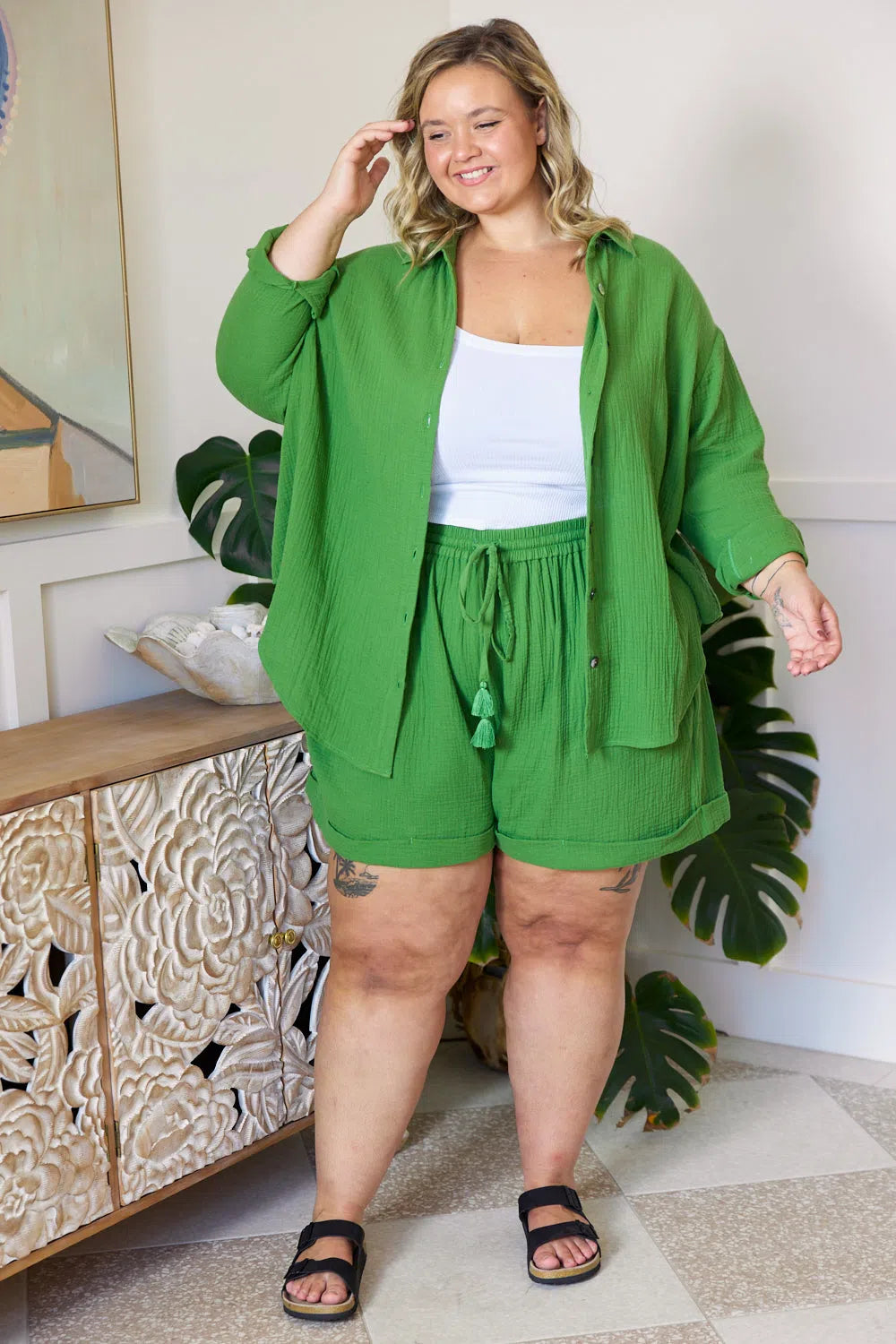 Annika wears a size 14/16 in the Romy Shorts.
