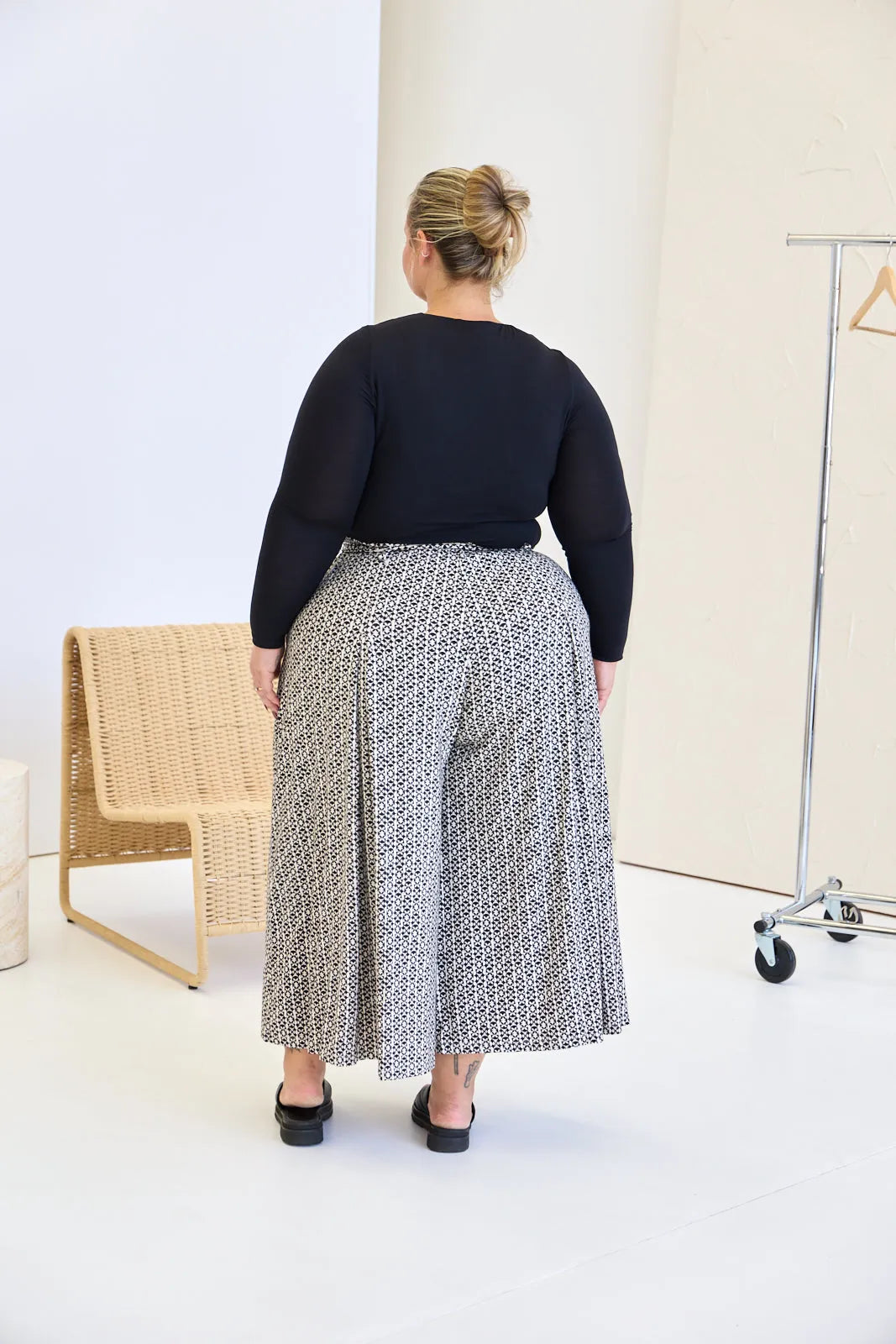 • Wide leg with pleats at front and back