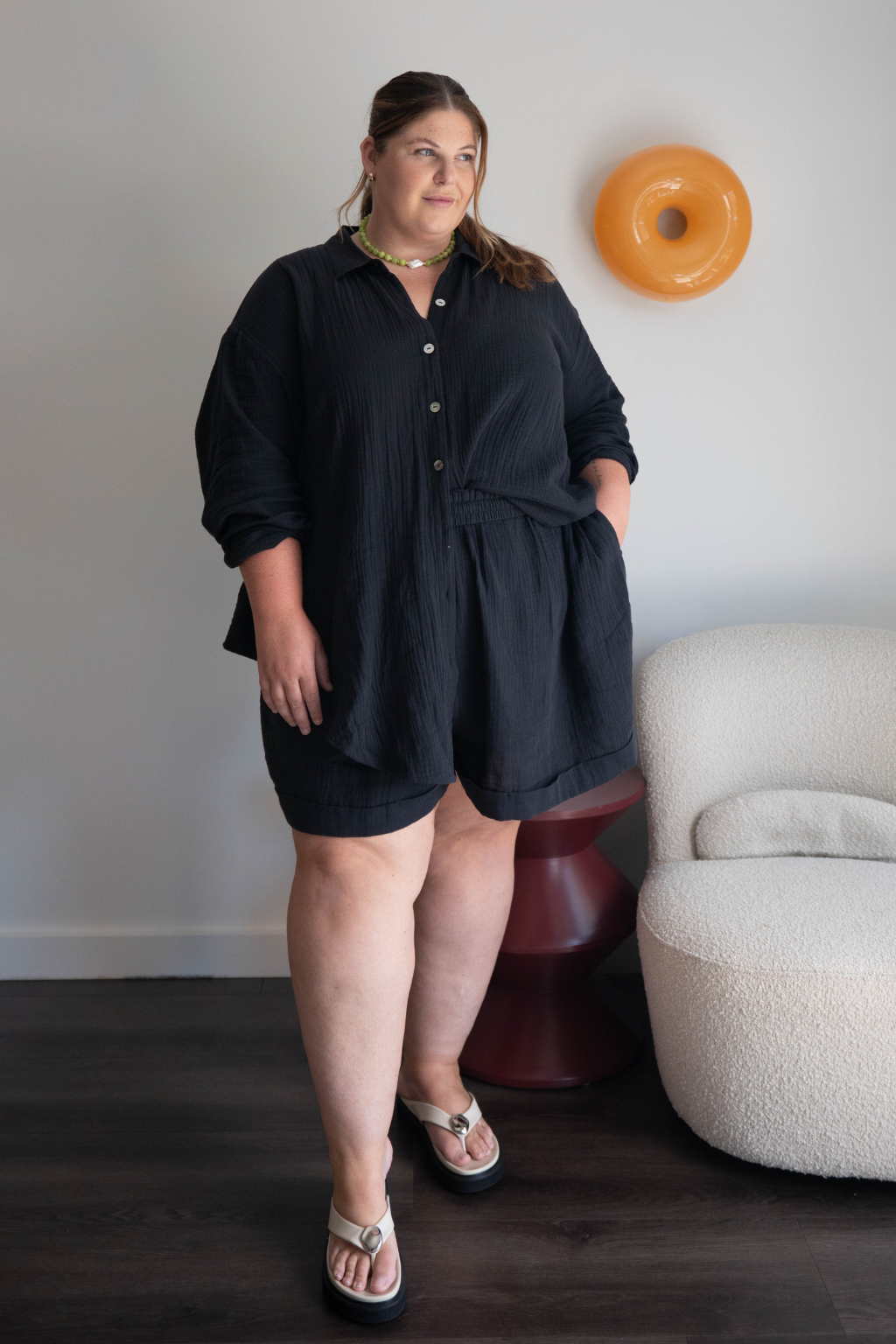 Annika wears a size 14/16 in the Romy Shorts.